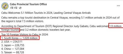 세부 관광 당국에 따르면 지난해 세부를 방문한 외국인 관광객 190만명 가운데 한국인이 103만명으로 54.1%를 차지했다.