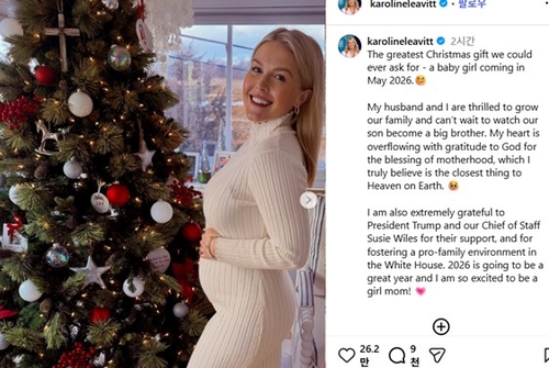 레빗 대변인은 이날 인스타그램에 임신한 자기 모습을 찍은 사진과 함께 실은 글에서 "우리가 바랄 수 있는 가장 훌륭한 크리스마스 선물인 딸이 내년 5월 태어난다"고 썼다.