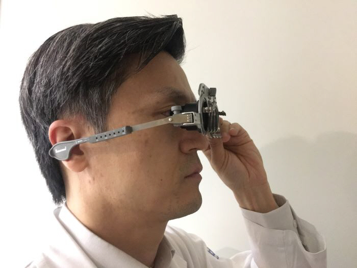 여의도성모 안과병원 황호식 교수가 본인이 직접 개발한 다초점인공수정체 체험장비를 착용하고 있다.