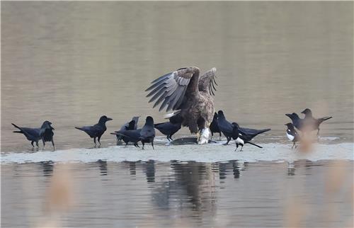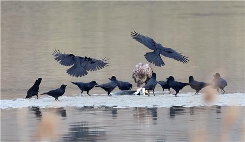 커다란 연어를 사냥한 대형 맹금류 흰꼬리수리 앞에서 조류계의 조폭으로 불리는 까마귀와 까치 총 16마리가 감히 덤빈다.