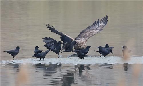 특히, 다른 새에 비해 대뇌가 발달해 학습 능력이 좋은 새로 알려진 까마귀는 무리로 몰려와 흰꼬리수리를 물고 뜯으며 집단으로 괴롭힌다.