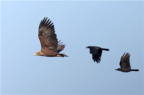 조폭 까마귀 서너 마리는 흰꼬리수리를 계속 쫓아가며 자신들의 영역 사수를 외친다.