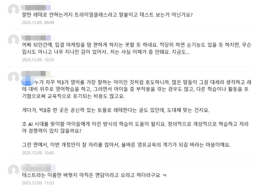 누리꾼들은 "말만 레테라 안 하는 것일 뿐 트라이얼 클래스(trial class·맛보기 수업)라고 말 붙이고 테스트 보는 거 아닌가요"('서***'), "오픈클래스 같은 걸로 대놓고 테스트는 아니지만 그래도 설명회 시간에 아이들 봐주는 명목으로 암암리에 평가하지 않을까 싶어요"('경***') 등 제도의 실효성에 대해 우려했다.