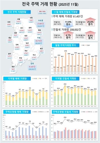 31일 국토교통부에 따르면 11월 전국의 주택 매매 거래량(신고일 기준)은 총 6만1천407건으로, 전월(6만9천718건) 대비 11.9% 감소했다.