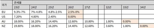 여기에 자유무역협정(FTA)에 따라 수입 우유 관세도 단계적으로 줄어든다. 미국산 우유는 올해 관세가 2.40%에서 2026년 1월부터는 무관세가 되고 유럽산 우유 관세는 올해 4.8∼2.5%에서 다음 달에는 2.5∼0%로 관세가 감소한다. 호주와 뉴질랜드산 우유는 각각 2033년과 2034년 무관세가 된다.