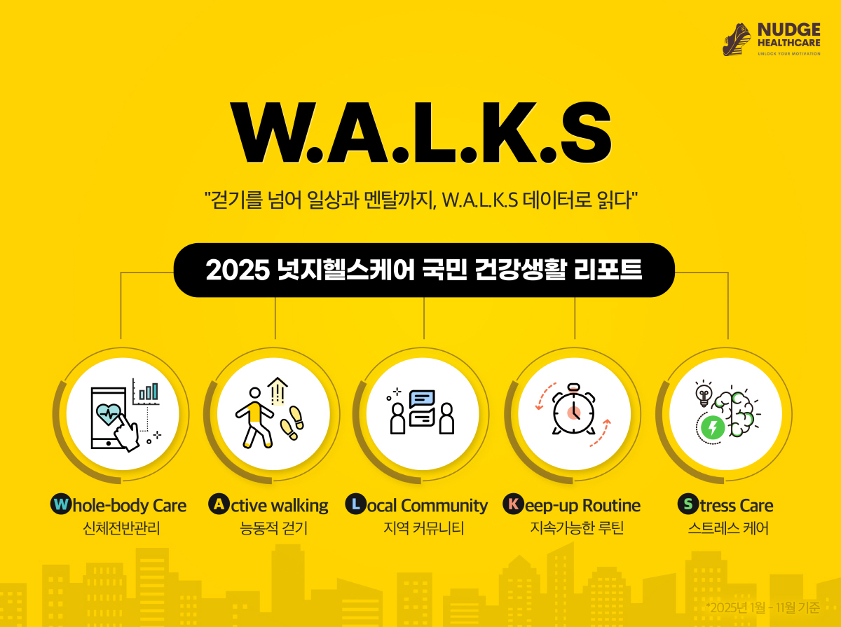 자사 플랫폼에 축적된 건강 행동 데이터를 분석한 이번 리포트는 단순한 체중 감량이나 운동 성과와 같은 결과 중심 지표에서 벗어나 국민들이 일상 속에서 건강 행동을 어떻게 실천하고 변화시켜 왔는지 그 과정을 살펴보는 데 주목했다. 캐시워크, 지니어트, 넛지EAP, 트로스트 등 넛지헬스케어의 주요 서비스에 축적된 유저의 실제 행동 데이터를 분석한 결과, 단순한 '걷기(Walk)'를 넘어 기록·루틴·지역 활동·멘탈 케어까지 확장된 일상 건강 행동을 'W.A.L.K.S' 키워드로 정리했다.