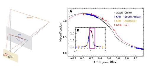 연구팀은 이어 미시중력렌즈 사건 당시 가이아 우주망원경이 16시간 동안 같은 영역을 6번 관측한 데이터를 결합, 관측 위치에 따라 물체 위치나 방향이 달라지는 시차(視差)를 이용해 미시중력렌즈 현상을 일으킨 천체의 위치와 질량을 측정했다.