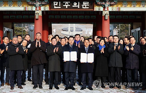 강 시장과 김 지사는 이날 오전 광주 국립 5·18민주묘지에서 새해 합동 참배하고 '광주·전남 통합 지방정부 추진 공동선언문'을 발표했다.