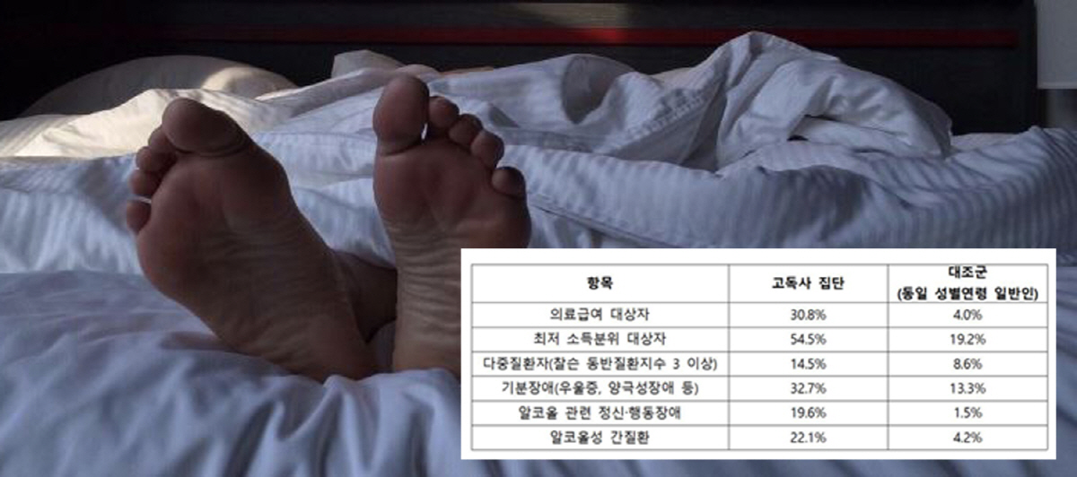 [스포츠조선 장종호 기자] 저소득층과 다중질환 및 정신질환, 알코올 관련 질환 등을 가진 사람이 고독사 위험도 높은 것으로 나타났다.