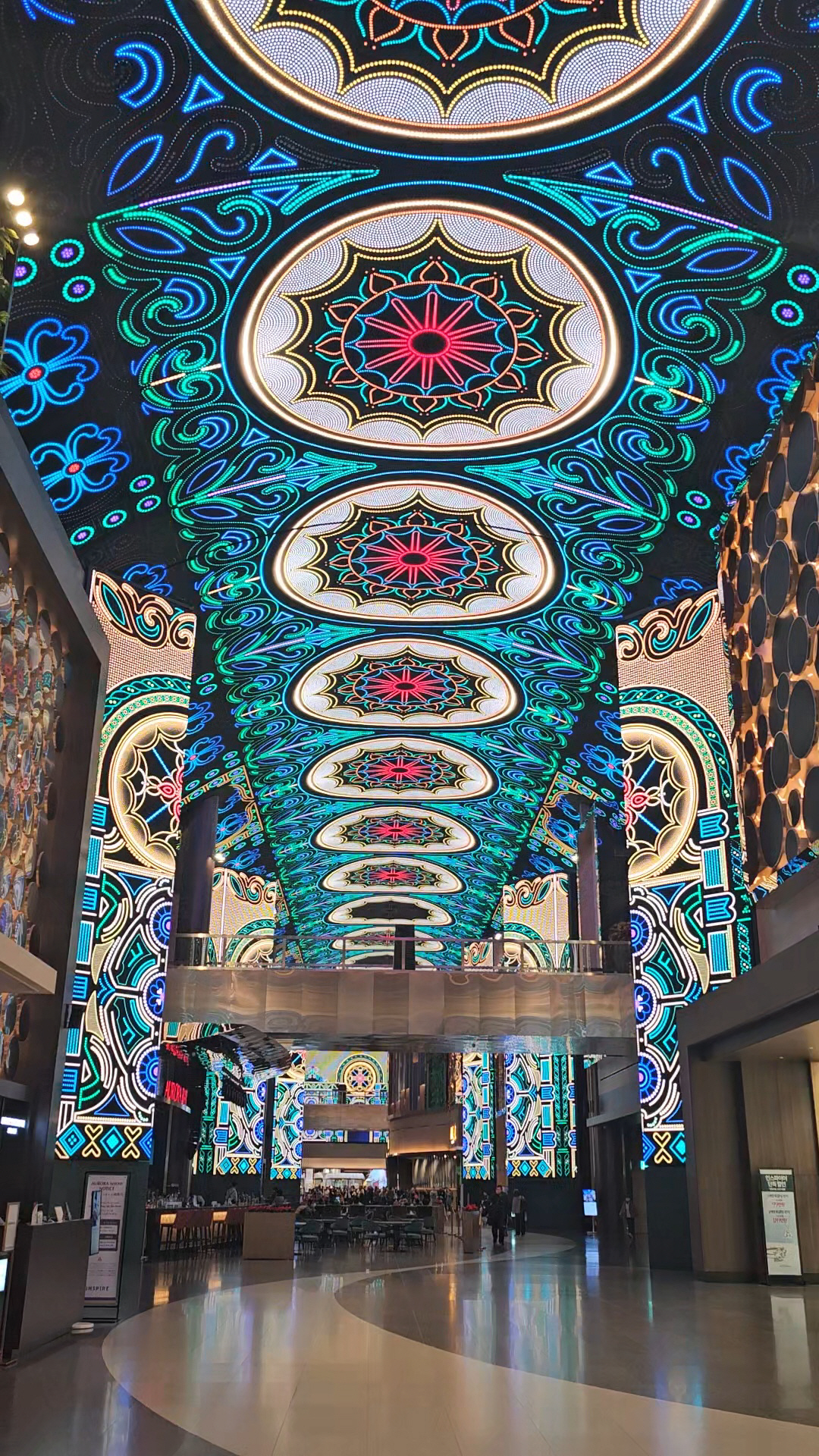 인스파이어 하면 빼놓을 수 없는 게 오로라다. 천장과 벽을 꽉 채운 영상, TV 광고에 봤던 곳이다. 150M의 길은 인스파이어 내부의 시설 이용을 위해 걷는 통로지만, 매시간 정시와 30분에 약 3분간 진행되는 미디어 아트는 인스파이어의 대표적 볼거리로 자리매김했다. 과거 대형 고래의 미디어 아트를 생각했다면 오산이다. 겨울 시즌에 맞춰 원터 원더랜드 테마의 영상과 음악에 눈과 귀가 즐겁다.