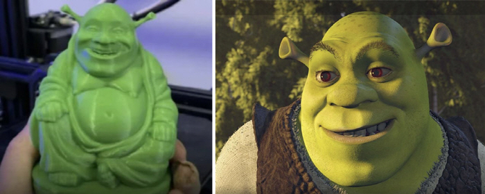 자세히 살펴본 결과 해당 조형물이 다름 아닌 영화 '슈렉'의 주인공 슈렉을 본뜬 3D 프린팅 모형임을 알아챘다.