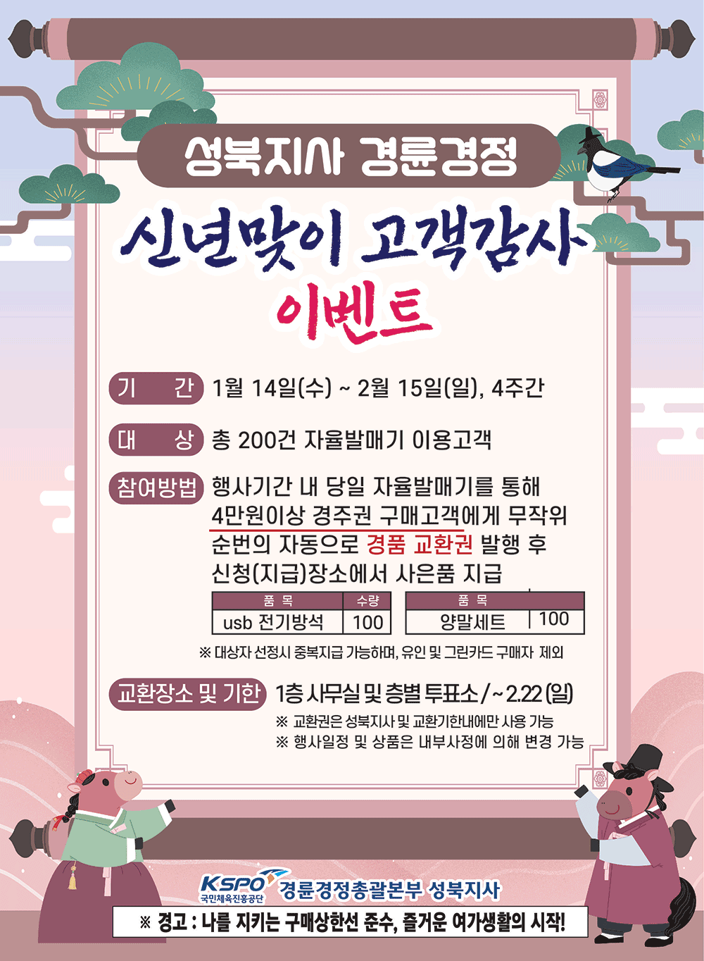 서울올림픽기념 국민체육진흥공단(이사장 하형주) 경륜경정총괄본부가 13일 '성북지사 신년맞이 고객감사' 이벤트 실시를 발표했다.