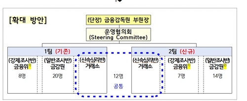 현재 합동대응단은 강제조사반(금융위), 일반조사반(금감원), 신속심리반(거래소)의 3반 1팀 체제로 구성됐다.