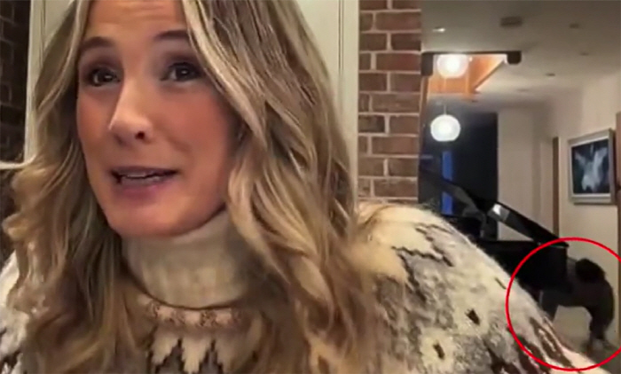 이때 그녀의 집 배경에서 남편 제이슨 러셀 하비(전 란페어풀 FC 축구 선수)가 카메라에 잡히지 않으려 네 발로 기어가는 모습이 그대로 방송됐다.