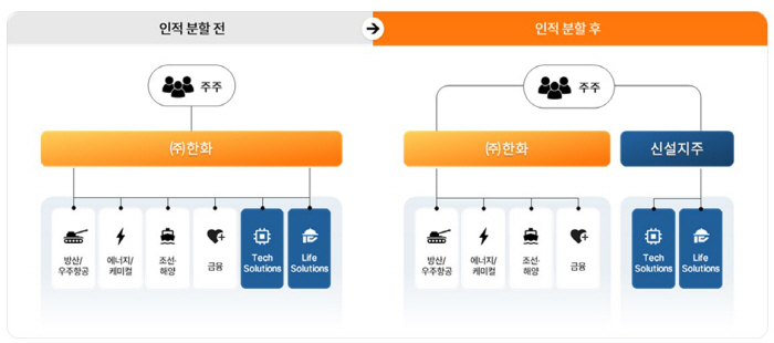 인적분할이 되면 한화비전·한화모멘텀·한화세미텍·한화로보틱스 등 테크 분야 계열사와 한화갤러리아·한화호텔앤드리조트·아워홈 등 라이프 분야 계열사는 신설법인(한화머시너리앤서비스홀딩스)에 속한다. 한화에어로스페이스·한화오션·한화솔루션·한화생명 등 방산 및 조선·해양, 에너지, 금융 계열사는 존속법인에 속하게 된다. 분할 비율은 순자산 장부가액을 기준으로 존속법인 76.3%, 신설법인 23.7%로 산정됐다. 기존 주주들은 분할 비율대로 존속법인과 신설법인 주식을 배정받게 된다.