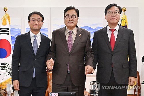 (서울=연합뉴스) 배재만 기자 = 우원식 국회의장(가운데)이 15일 국회 국회의장실에서 여야 원내대표 회동을 주재하기 위해 입장하고 있다. 사진 왼쪽은 더불어민주당 한병도 원내대표, 오른쪽은 국민의힘 송언석 원내대표의 입장 모습. 2026.1.15 scoop@yna.co.kr
