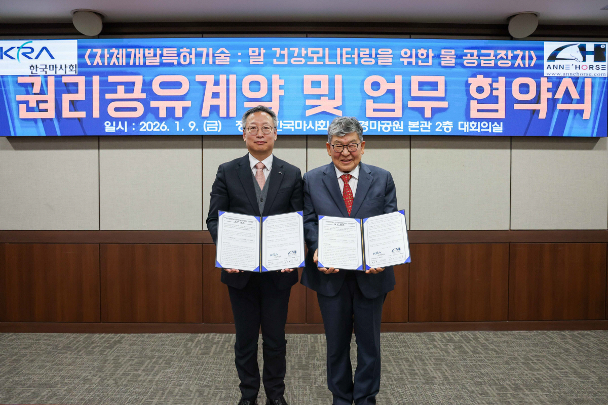 한국마사회(회장 정기환)가 지난 9일 서울경마공원 본관 2층 대회의실에서 승마·마사시설 전문업체인 ㈜앤호스(대표 김일홍)와 '말의 건강모니터링을 위한 물 공급장치' 특허기술에 대한 권리공유계약 및 업무협약을 체결했다.