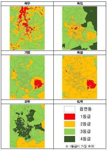 또 지역별 기후 특성과 토지이용 특성에 대한 종합적인 분석을 통해 현재와 미래의 취약성 등급안을 도출하고, 국토연구원의 검증을 거쳐 집계구별 재해 등급(Ⅰ∼Ⅳ)을 확정했다.