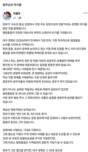 이어 "그렇다면 대구·경북은 행정통합의 길로 나아갈 충분한 이유와 동력을 갖게 된다. 이를 위해 먼저 정부에 이번 발표의 진위와 구체적인 내용을 확인하겠다. 지방이 진짜로 도약할 수 있는 길인지 그 답을 분명히 요구하겠다"고 말했다.