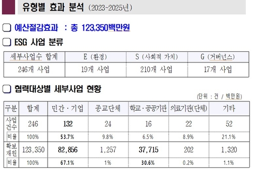 협력 대상별로는 민간·기업과의 협력사업(132건, 절감 효과 829억원)이 가장 많았고, 학교·공공기관(16건, 377억원), 종교단체(24건, 13억원)가 뒤를 이었다.