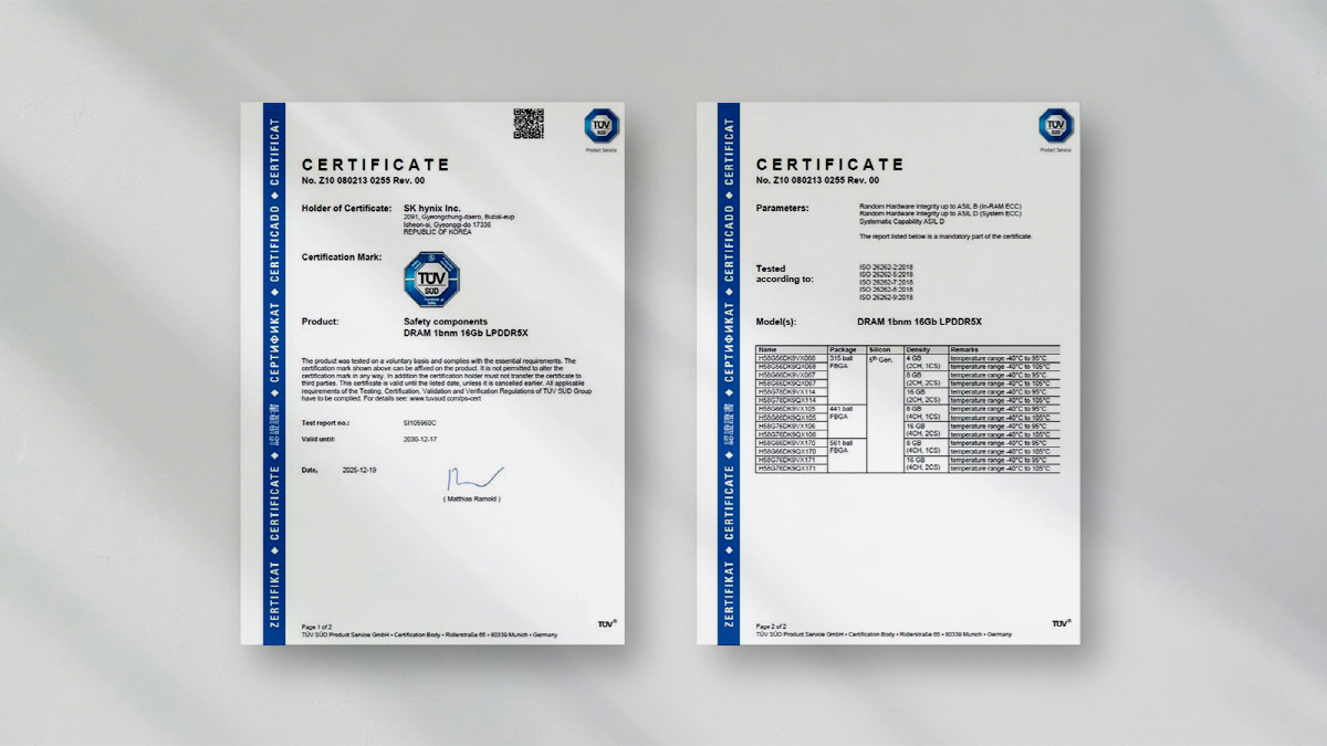 TUV SUD는 심사에서 LPDDR5X 제품의 기능 안전 성능뿐만 아니라 안전 아키텍처 및 설계 개념, 오류 예방 · 탐지 · 진단 메커니즘, 개발 및 검증 프로세스, 품질 관리 체계 전반 등을 종합적으로 검증했다. 이를 통해 SK하이닉스의 개발 · 검증 · 품질 프로세스가 글로벌 자동차 산업 기준에 부합함을 인정했다.