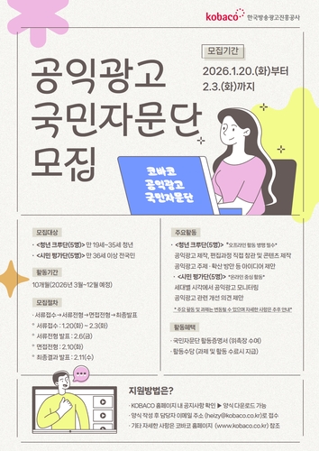 ▲ 한국방송광고진흥공사(코바코)가 공익광고 제작에 국민의 참여와 소통을 확대하기 위해 '2026년 공익광고 국민자문단'을 10명 모집한다. 코바코는 기존의 청년 중심 '공익광고 청년자문단'을 올해부터 전 국민이 참여할 수 있도록 개편했다. 모집 기간은 다음 달 3일까지로 자세한 사항은 코바코 공식 누리집(https://www.kobaco.co.kr) 공지사항 게시판을 통해 확인할 수 있다. (서울=연합뉴스)