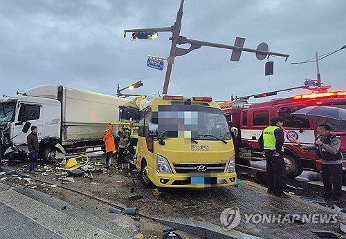 (김제=연합뉴스) 나보배 기자 = 지난달 전북 김제에서 12명이 다친 초등학생 통학버스 사고와 관련해 화물트럭 운전자가 구속됐다.