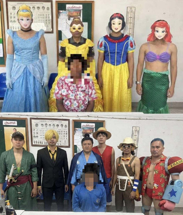[스포츠조선 장종호 기자 태국 경찰이 백설공주, 인어공주 등 디즈니 만화 캐릭터 의상을 입고 범죄 용의자와 함께 직은 사진이 화제다.