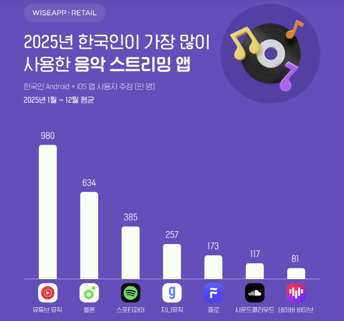 와이즈앱·리테일이 2025년 한 해 한국인 스마트폰 사용자를 표본 조사한 결과, 유튜브 뮤직은 월평균 사용자 수 980만명으로 최다 사용 음악 스트리밍 앱 1위에 올랐다.