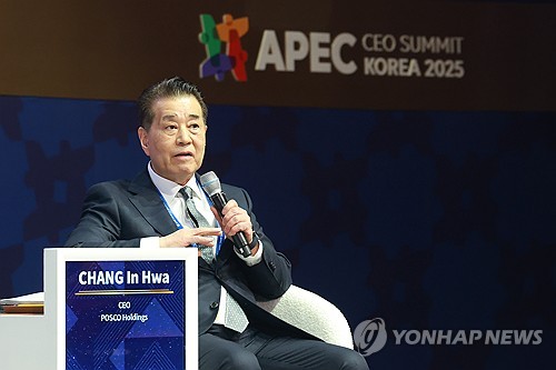 (경주=연합뉴스) 이동해 기자 = 30일 경북 경주 예술의전당에서 열린 아시아태평양경제협력체(APEC) 정상회의 최고 경영자(CEO) 서밋(Summit) '세션 10 : 탄력적이고 친환경적인 글로벌 공급망 구축'에서 장인화 포스코그룹 회장이 발언하고 있다. 2025.10.30 [공동취재] eastsea@yna.co.kr