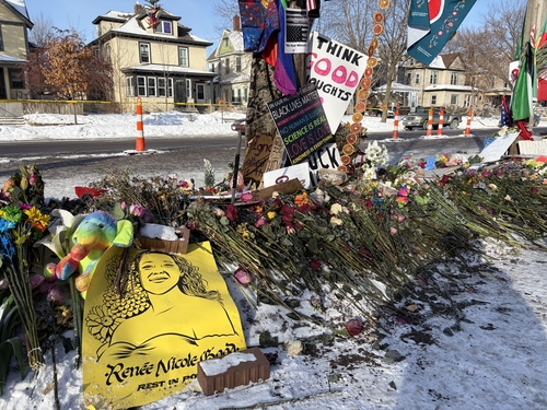 (미니애폴리스=연합뉴스) 권영전 특파원 = 20일(현지시간) 미국 미네소타주 미니애폴리스에 있는 르네 니콜 굿의 추모 공간에 추모객들이 두고 간 꽃과 피켓이 놓여져 있다.