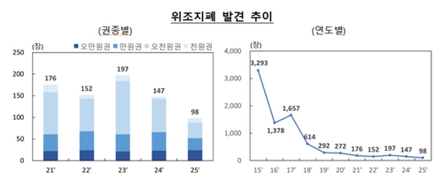 한은 관계자는 "연간 위조지폐는 2017년까지 1천장을 넘었다가 꾸준히 감소해 지난해 처음 100장을 밑돌았다"고 설명했다.