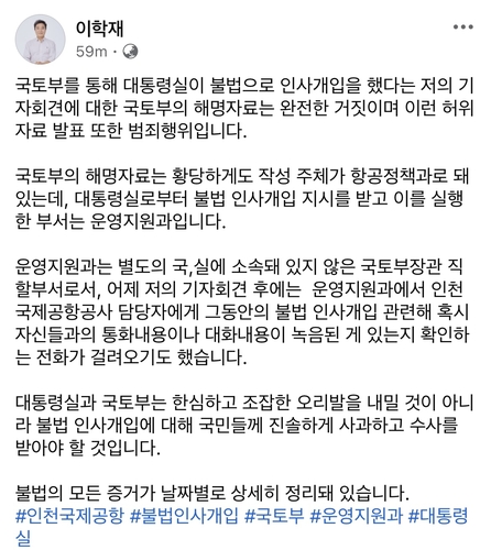 이 사장은 "국토부의 해명자료는 황당하게도 작성 주체가 항공정책과로 돼 있는데 대통령실로부터 불법 인사개입 지시를 받고 이를 실행한 부서는 운영지원과"라고 주장했다.