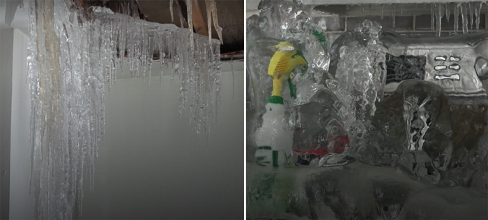 벽과 천장, 가구, 가전제품까지 두꺼운 얼음으로 뒤덮여 있었고, 바닥에는 약 30cm 두께의 얼음이 만들어져 있었다.