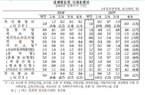 4분기 성장률은 한은이 두 달 전 제시한 예상치(0.2%)보다 0.5%p나 낮으며, 2022년 4분기(-0.4%) 이후 3년 만에 가장 낮은 기록이다.
