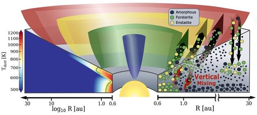 이 원반풍이 고온 내부 원반 표면에서 만들어진 결정질 규산염을 들어 올려 차가운 원반 외곽으로 운반할 수 있는 물리적 경로를 제공한다고 해석한 것이다.