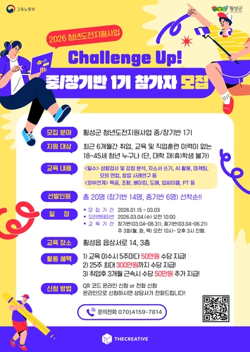 모집 대상은 최근 6개월간 취업 및 교육 이력이 없는 18세 이상 45세 이하 청년으로 오는 3월 3일까지 모집한다. 횡성군 및 인근 지역 거주자라면 누구나 신청할 수 있으며, 대학 재학생과 휴학생은 제외된다.