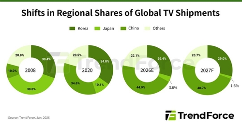 트렌드포스는 합작회사가 운영을 시작하는 2027년에는 중국 TV 브랜드의 시장 점유율(출하량 기준)이 48.7%까지 상승할 것으로 내다봤다. 삼성전자, LG전자 등 한국 TV 브랜드의 점유율은 20.7%로 전망된다.