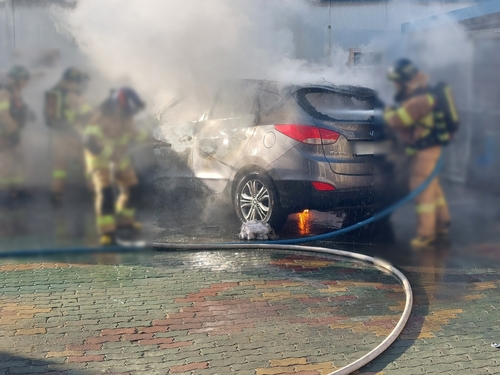 (부산=연합뉴스) 김재홍 기자 = 22일 오전 9시께 부산 사상구 한 초등학교 야외주차장에 있던 60대 통학버스 기사 A씨의 SUV 차량에서 폭발음과 함께 불이 났다.