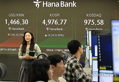 (서울=연합뉴스) 최재구 기자 = 21일 서울 중구 하나은행 본점에서 직원들이 증시와 환율을 모니터하고 있다. 이날 코스피는 상승 출발해 장 초반 4,980대를 나타내고 있다. 오전 9시 2분 현재 코스피는 전장보다 27.94포인트(0.56%) 오른 4,980.47이다. 2026.1.23 jjaeck9@yna.co.kr