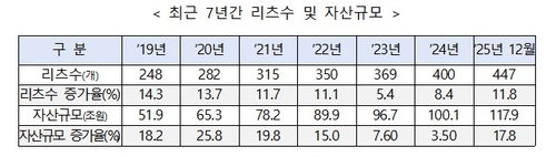 리츠 자산 규모 증가율도 2023년과 2024년에 각각 7.6%, 3.5%에 그쳤지만 지난해에는 17.8%로 확대되며 총자산이 117조9천억원에 이르렀다.