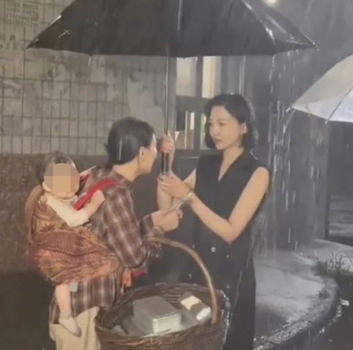당시 촬영된 장면은 그녀가 등에 아이를 업은 채 비를 맞고 있는 한 여성에게 우산과 돈을 건네는 내용이었다.