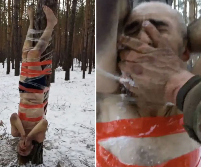 [스포츠조선 장종호 기자] 러시아군 지휘관들이 탈영과 명령 불복종 혐의를 받은 병사 두 명을 나무에 묶어놓고 눈을 억지로 먹이는 충격적인 영상이 공개돼 국제 사회의 공분을 사고 있다.