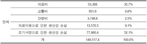 직접비용인 의료비가 5조3천388억원으로 그다음이었고, 의료 이용으로 인한 생산성 손실 1조3천571억원, 간병비 3천747억원 등이었다.