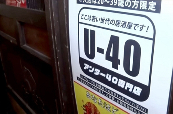 TV 아사히 등 일본 매체들에 따르면 최근 도쿄 시부야에 위치한 한 이자카야식 술집이 '이곳은 젊은 세대를 위한 공간. U-40(40세 이하) 전문 바'라는 문구가 적힌 안내판을 붙였다.