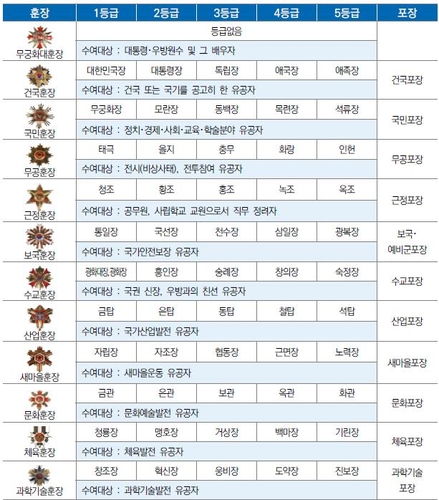 연합뉴스가 행안부에 정부가 수여한 훈장 규모 등에 대해 정보공개를 신청해 확보한 자료에 따르면 1948년 대한민국 정부가 수립된 이래 수여된 훈장은 78만8천104개로 나타났다.