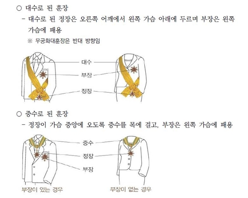 예컨대 건국훈장은 대한민국장·대통령장·독립장·애국장·애족장으로, 산업훈장은 금탑·은탑·동탑·철탑·석탑 등으로 나뉘는 식이다.