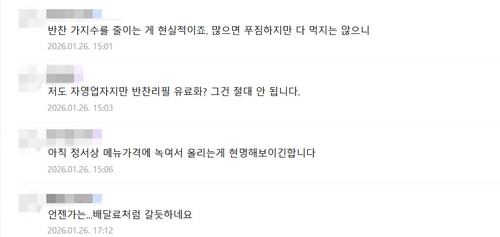 다만 자영업자 네이버 카페 댓글 창에는 "깍두기 고봉으로 3번씩 가져다 드시면 남는 게 없다", "명함만 한 김 1장이 25원이 넘습니다. 손님들 적당량 주면 몇번씩 더 달라는 사람 많습니다" 등 반찬 리필 유료화가 필요하다는 댓글이 달렸다.