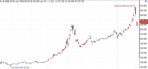 3일 한국거래소 정보데이터시스템에 따르면 이날 국내 금 시세(99.99_1kg)는 전장보다 3.68% 오른 1g당 23만6천90원에 장을 마쳤다.