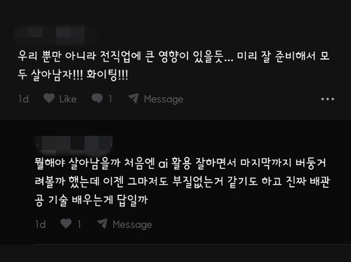 이런 가운데 현직 개발자라고 밝힌 한 이용자는 지난 1일 "이제 '개발자가 사라진다'가 아니라 '도구가 바뀐다'고 인식해야 할 때"라며 "개발자가 대체되지 않는 건 아니지만 AI로 시대가 변하는 만큼 개발자의 역할도 다양해지고 있으니 스스로 경쟁력을 갖춰야 한다"고 적기도 했다.